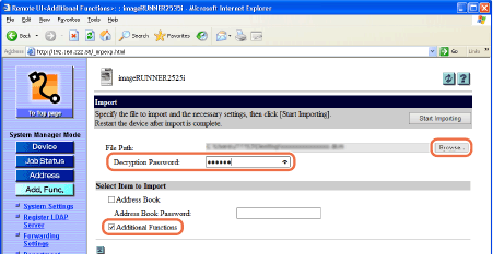 The Import/Export function is available only when the Remote UI is in the System Manager Mode.