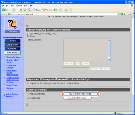 The Certificate Settings are available only when the Remote UI is in the System Manager Mode.
