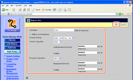 Specifying the settings for SNMPv3 is available only when the Remote UI is in the System Manager Mode.