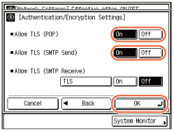 Press [On] for <Allow TLS (POP)> and/or <Allow TLS (SMTP Send)>, depending on your network environment → press [OK] to return to the [E-mail/I-Fax] screen.