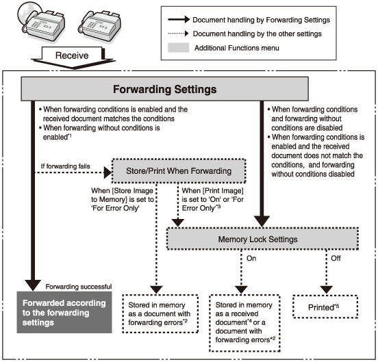 *3 If Print Image in Store/Print When Forwarding in System Settings is set to ‘For Error Only,’ documents with forwarding errors are printed. If Print Image in Store/Print When Forwarding in System Settings is set to ‘On,’ all of the forwarded documents (including those with forwarding errors) are printed. However, if Memory Lock is set to ‘On’, forwarded documents are printed when Memory Lock is set to ‘Off’.