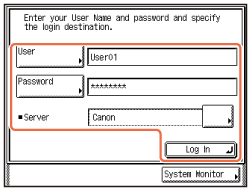В случае появления показанного ниже экрана введите имя пользователя и пароль, затем укажите местоположение входа в систему → нажмите клавишу [Вход в сис.].