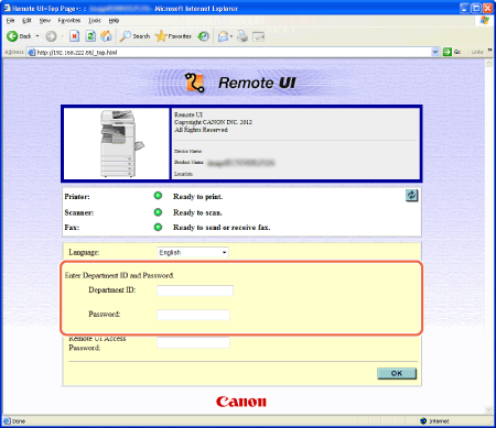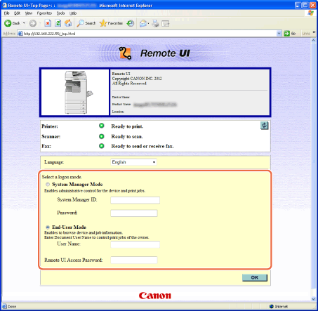 Select the logon mode and enter the System Manager ID and System Password, or user name and Remote UI Access Password.