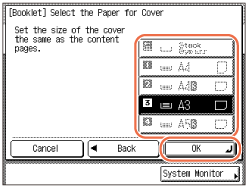 Zvoľte zdroj papiera pre stranu prebalu → stlačte [OK] → [Hotovo].