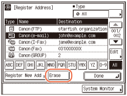 [Skupina]: Zobrazia sa miesta určenia uložené ako skupinové adresy. [Fax]: Zobrazia sa uložené miesta určenia faxu. [E-mail]: Zobrazia sa uložené miesta určenia e-mailu. [I-fax]: Zobrazia sa uložené miesta určenia I-faxu. [Súbor]: Zobrazia sa uložené miesta určenia súborového servera. |