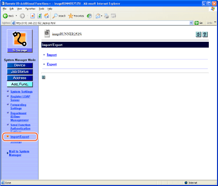 The Import/Export function is available only when the Remote UI is in the System Manager Mode.