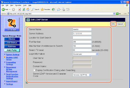 Specifying the LDAP server settings is available only when the Remote UI is in the System Manager Mode.