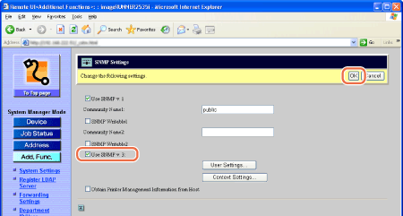 Specifying the settings for SNMPv3 is available only when the Remote UI is in the System Manager Mode.