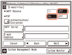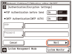 Press [Off] both for <SMTP Authentication (SMTP AUTH)> and <POP Authentication before Send> → press [Next].