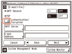 Specify whether to display the SMTP authentication screen each time you send e-mails and I-faxes. To always display the SMTP authentication screen when sending e-mails and I-faxes, select [On].