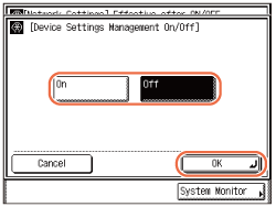 ] until [Device Settings Management On/Off] appears → press [Device Settings Management On/Off].