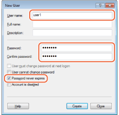 In the [New User] dialog box, enter the user name in [User name] → enter the password in [Password] → re-enter the password in [Confirm password].
