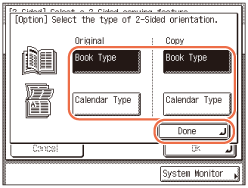 Pritisnite [Knjiga] ali [Koledar] in izberite tip usmerjenosti originalov in kopij → pritisnite [Konec] → [OK].