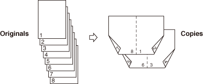 Načina Brošura ne morete uporabljati skupaj z načini Avtomatska izbira papirja, 2-stransko kopiranje, Sortiranje, Deljeno kopiranje, Brisanje okvirja, Originali različnih velikosti ali Kopija ID kartice.
