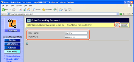 In IEEE802.1X port-based authentication, a key pair (or a private key and certificate) in PKCS#12 format is required for enabling the EAP-TLS method on the client device. If you want to access the machine securely from a web browser (Remote UI), generate a key pair and set it for TLS communications. Up to three key pairs can be registered.