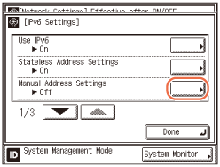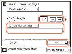 Press [Manual Address] → enter the IPv6 address value → press [OK].