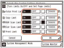 ] (Page Limit) next to [On]/[Off] of the desired function(s) → enter the page limit restriction using