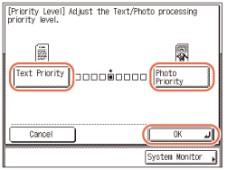 Tryck på [Textprioritet] eller [Fotoprioritet] för att ändra prioritetsnivån för text respektive foto → tryck på [OK].
