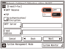 Press [Off] both for <SMTP Authentication (SMTP AUTH)> and <POP Authentication before Send> → press [Next].