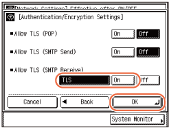 Press [TLS] or [On] for <Allow TLS (SMTP Receive)> depending on your network environment → press [OK].