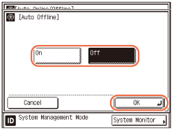 If the machine is connected to a network that is online, scanning may not be possible. By setting Auto Offline to ‘On’, the machine automatically goes offline when the Auto Clear mode initiates, or when two minutes have passed if the Auto Clear time is not set.