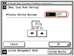 [On]: Displays an alert message when the memory consumption reaches the level to be specified in the next step. Press [OK] → go to the next step.