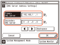 Press [Secondary DNS Server] → enter the IP address of the DNS server using - (numeric keys).