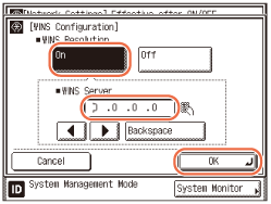 Changes made to WINS Configuration become effective when the machine is restarted. To restart the machine, turn it OFF, wait at least 10 seconds, and then turn it ON. For instructions on how to turn the machine ON and OFF, see Chapter 2, “Before You Start Using the Machine,” in the User’s Guide.