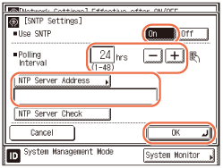 Press [NTP Server Address] → enter the NTP server’s address → press [OK].