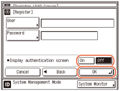 If Authorized Send is activated, <Carry Over Send Auth. Info.> appears on the top of the Register screen. Press [On] to use the same user name and password as the login information for Authorized Send or [Off] to use the user name and password registered at this step.