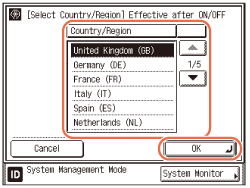 Changes made to Select Country/Region become effective when the machine is restarted. To restart the machine, turn it OFF, wait at least 10 seconds, and then turn it ON. For instructions on how to turn the machine ON and OFF, see Chapter 2, “Before You Start Using the Machine,” in the User’s Guide.