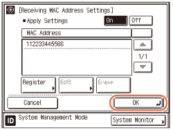 If you want to edit a MAC address, select the MAC address on the Receiving MAC Address Settings screen → press [Edit] → edit the address in the same manner as to register them → press [OK].