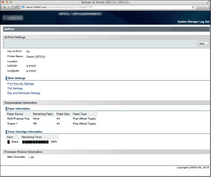You can register information, including the name of the machine and installation location, that is used for identifying the machine. You can also disable the AirPrint function of the machine. Use the Remote UI to change these settings.