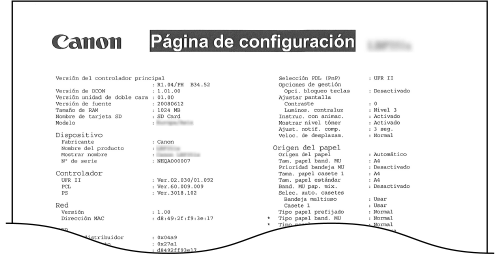 Menú de configuración), el contenido registrado en el equipo y otra información en forma de lista. En resto de información incluye la cantidad de tóner restante, el número de páginas impresas y la capacidad de la memoria (RAM) montada en el equipo. Los elementos de configuración cuyo nombre va precedido de un asterisco (