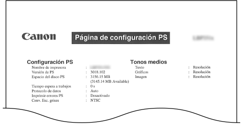 Las opciones para utilizar el modo PS y los elementos de información interna registrados en el equipo se imprimen en forma de lista.