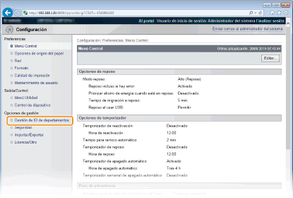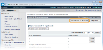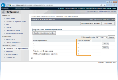 Para imprimir el resultado de la verificaciónPara poner el contador de páginas a ceroSi desea poner el contador de páginas a cero para cada departamento, haga clic en el enlace de texto [ID del departamento], y haga clic en [Eliminar recuento]