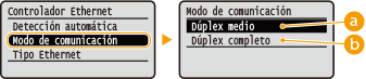 Seleccione <Dúplex medio> o <Dúplex completo> ![]() ![]() <Dúplex medio>Envía y recibe datos de comunicación de forma alternativa. Seleccione cuándo se conecta el equipo a un dispositivo de red utilizando Dúplex medio.