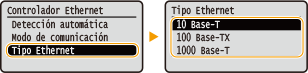 Seleccione el tipo de Ethernet ![]() ![]() ![]() Al seleccionar <1000 Base-T>, la configuración de <Modo de comunicación> cambia a <Dúplex completo>.