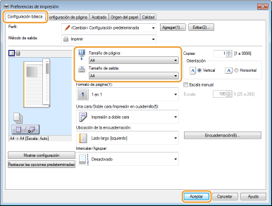 Seleccione el tamaño del papel en [Tamaño de salida]