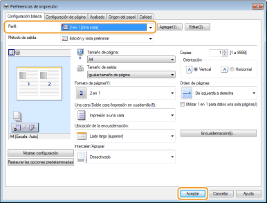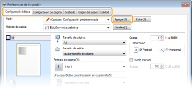Haga clic en la pestaña [Configuración básica], [Configuración de página], [Acabado], [Origen del papel] o [Calidad] para especificar las opciones de impresión en cada pantalla según sea necesario.
