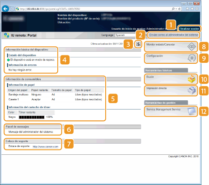 Muestra un mensaje del Administrador de sistema especificado en [Panel de mensajes/Enlace de soporte] dentro de [Configuración]
