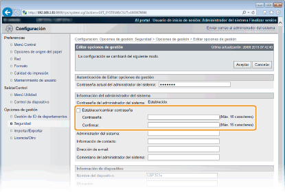 Para cambiar las opciones configuradas en el equipo desde la IU remota hacen falta privilegios administrativos. Siga el procedimiento que se muestra a continuación para cambiar la contraseña del Administrador del sistema. La información de configuración contraseña del Administrador del sistema es crítica para la seguridad del equipo, así que debe asegurarse de que solo los administradores conocen la contraseña del Administrador del sistema.