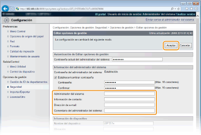 Introduzca el nombre y la información de contacto del Administrador de sistema según proceda, y haga clic en [Aceptar].
