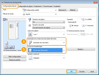 Você pode produzir impressões de um lado ou dos dois lados. A configuração padrão é [Impressão dos dois lados]. Altere as configurações conforme necessário.