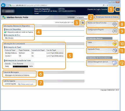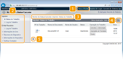 Exibe a página [Monitor de Status/Cancelar]. Esta página pode ser usada para verificar o status de impressão atual, cancelar o processamento de impressão e ver o histórico de trabalhos de impressão.