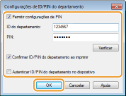 Marque a caixa de seleção para exibir a tela pop-up [Confirmar ID/PIN do departamento] sempre que você imprimir ou enviar um fax de um computador.