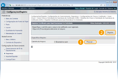 Clique em [Procurar] em [Caminho do Arquivo], especifique o arquivo para a solicitação de assinatura de certificado e clique em [Registrar].