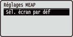 Tous les réglages relatifs à l'écran principal sur MEAP sont répertoriés et accompagnés d'une brève description. Les réglages par défaut sont signalés par une croix ().