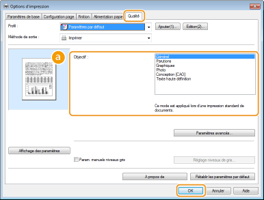 Pour définir des paramètres détaillés pour chaque élément sélectionné dans [Objectif], cliquez sur [Paramètres avancés]. Pour en savoir plus, cliquez sur [Aide], dans l'écran du pilote d'imprimante.
