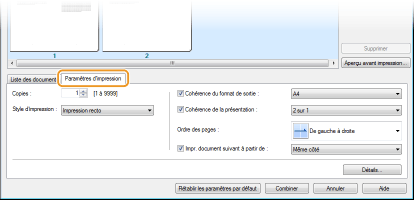 Cliquez sur l'onglet [Paramètres d'impression] pour afficher l'écran destiné à définir la configuration de l'impression telle que le nombre de copies et l'impression recto/recto verso. Les réglages spécifiés à ce stade concernent l'intégralité de la tâche d'impression.